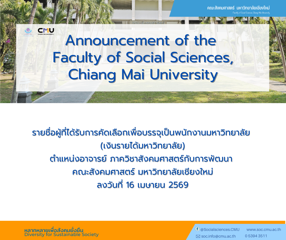 รายชื่อผู้มีสิทธิ์เข้ารับการคัดเลือก (สัมภาษณ์) ระดับคณะตำแหน่งอาจารย์ ภาควิชาสังคมวิทยาและมานุษยวิทยา ตำแหน่งเลขที่ EP210012