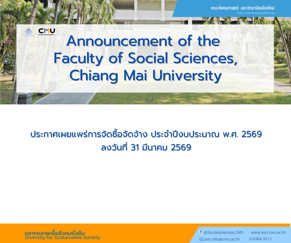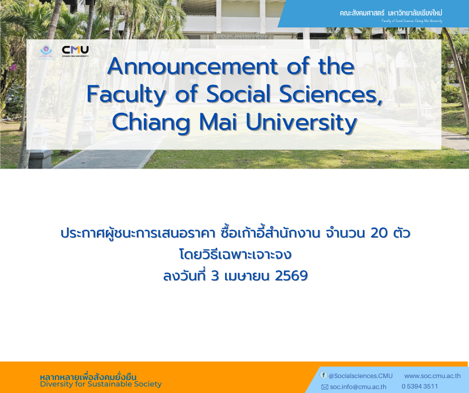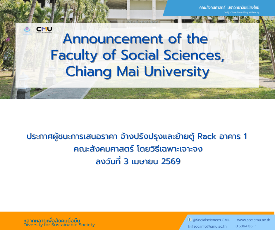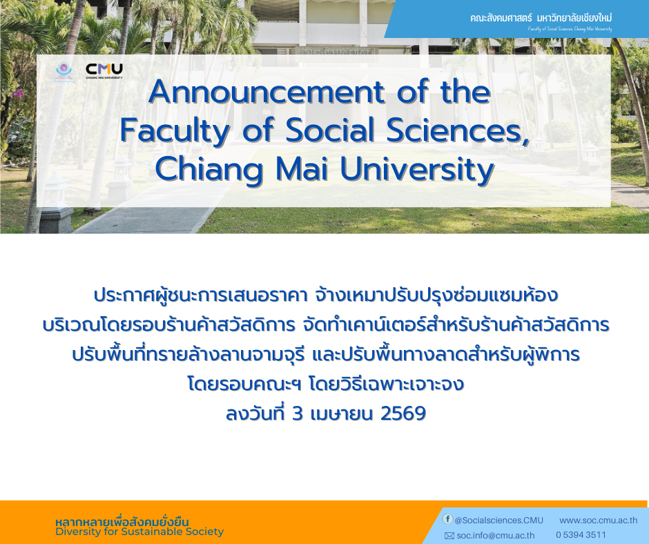ประกาศผู้ชนะการเสนอราคา จ้างปรับปรุงพื้นที่ทางเชื่อมอาคารปฏิบัติการและอาคาร 4 คณะสังคมศาสตร์ มหาวิทยาลัยเชียงใหม่ โดยวิธีเฉพาะเจาะจง