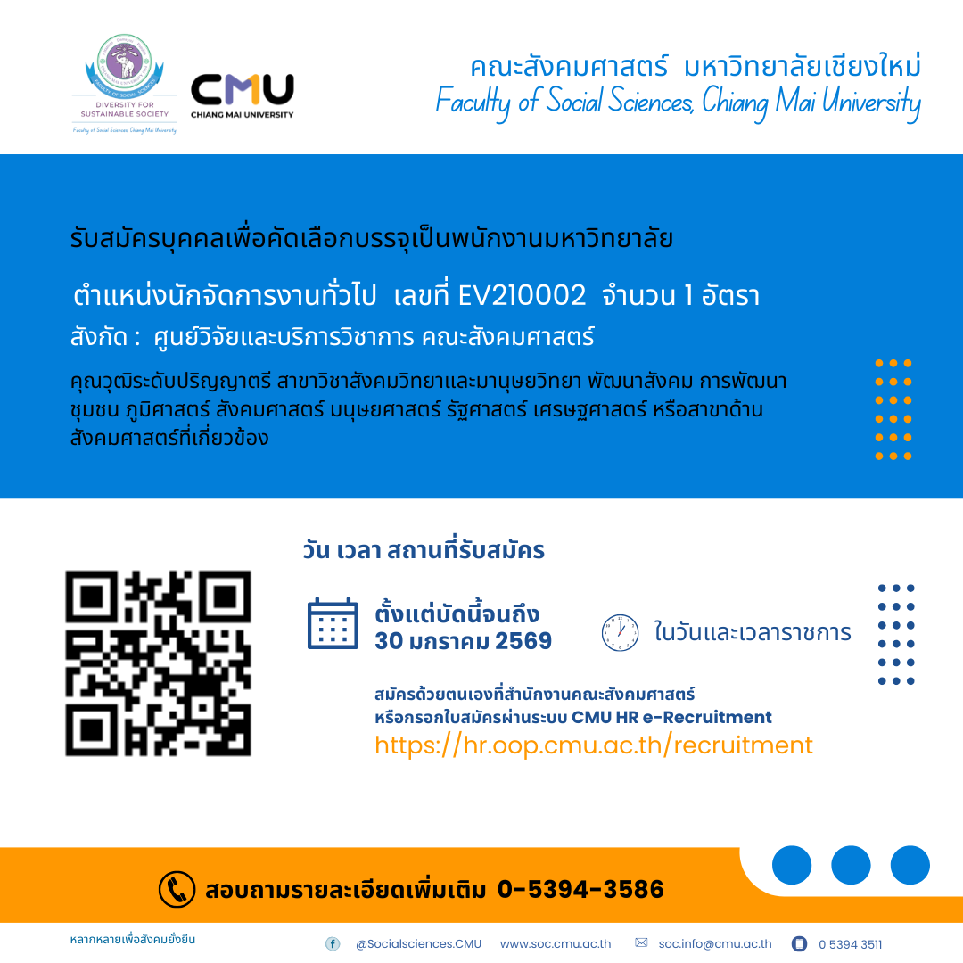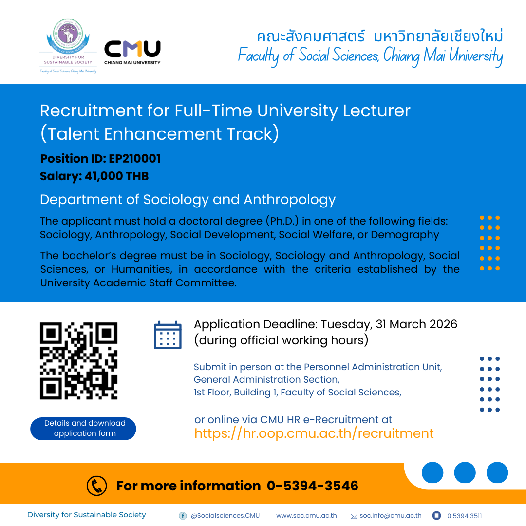 รับสมัครบุคคลเพื่อสอบคัดเลือกบรรจุเป็นพนักงานมหาวิทยาลัย ตำแหน่งอาจารย์ EP210001 ภาควิชาสังคมวิทยาและมานุษยวิทยา คุณวุฒิระดับปริญญาเอก จำนวน 1 อัตรา