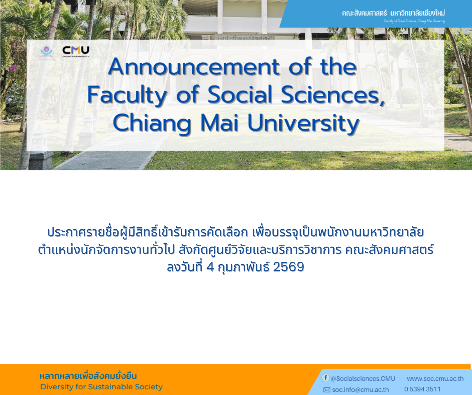 รับสมัครบุคคลเพื่อคัดเลือกบรรจุเป็นพนักงานมหาวิทยาลัยประจำ ตำแหน่งนักจัดการงานทั่วไป สังกัดศูนย์วิจัยและบริการวิชาการ คณะสังคมศาสตร์