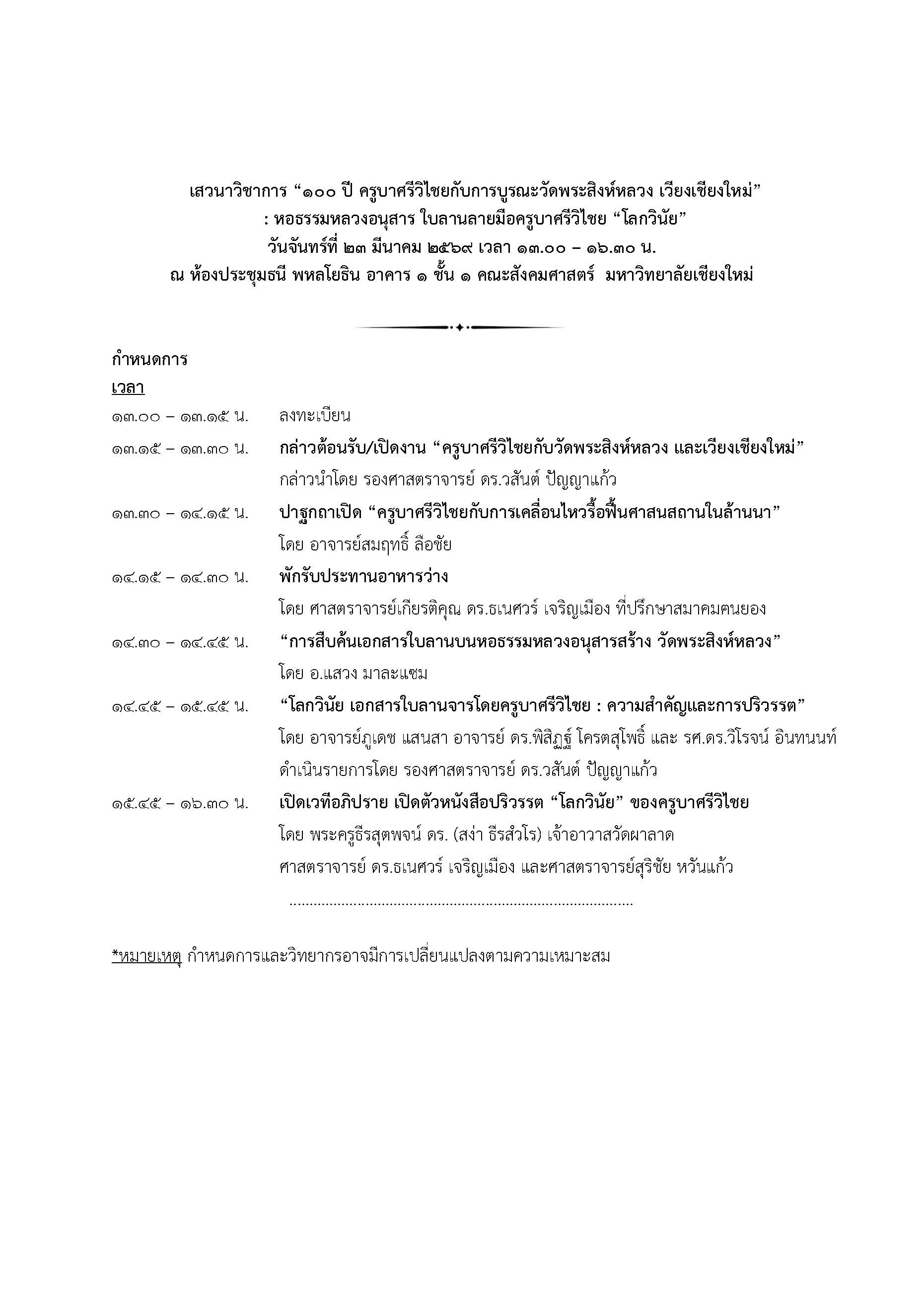 คณะสังคมศาสตร์ มหาวิทยาลัยเชียงใหม่ โดย ภาควิชาสังคมวิทยาและมานุษยวิทยา ร่วมกับ ศูนย์วิจัยและบริการวิชาการ คณะสังคมศาสตร์ มหาวิทยาลัยเชียงใหม่ เตรียมจัดงานเสวนาวิชาการเรื่อง “100 ปี ครูบาศรีวิไชยกับการบูรณะวัดพระสิงห์หลวง เวียงเชียงใหม่ : หอธรรมหลวงอนุสาร ใบลานลายมือครูบาศรีวิไชย ‘โลกวินัย’” ในวันจันทร์ที่ 23 มีนาคม 2569 เวลา 13.00 – 16.30 น. ณ ห้องประชุมธนี พหลโยธิน อาคาร 1 ชั้น 1 คณะสังคมศาสตร์ มหาวิทยาลัยเชียงใหม่ และถ่ายทอดสดผ่าน Facebook: Faculty of Social Sciences CMU