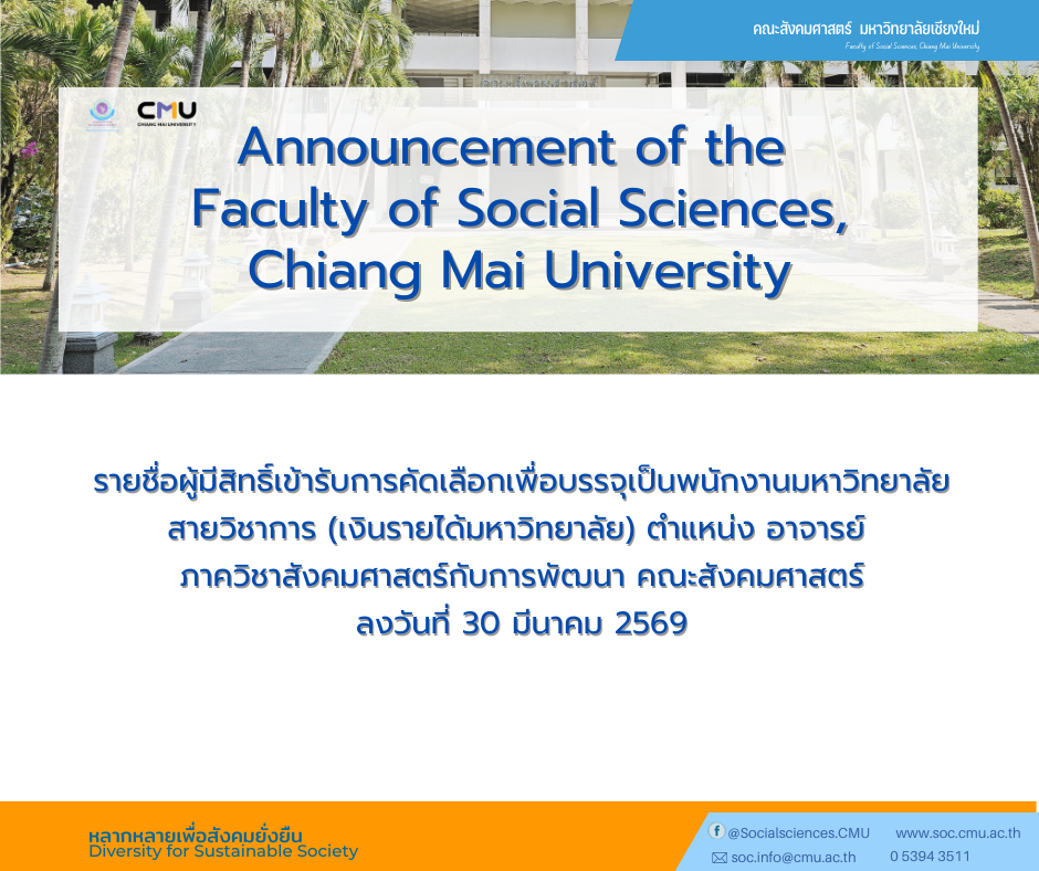 รายชื่อผู้มีสิทธิ์เข้ารับการคัดเลือกเพื่อบรรจุเป็นพนักงานมหาวิทยาลัย สายวิชาการ (เงินรายได้มหาวิทยาลัย) ตำแหน่ง อาจารย์ ภาควิชาสังคมศาสตร์กับการพัฒนา