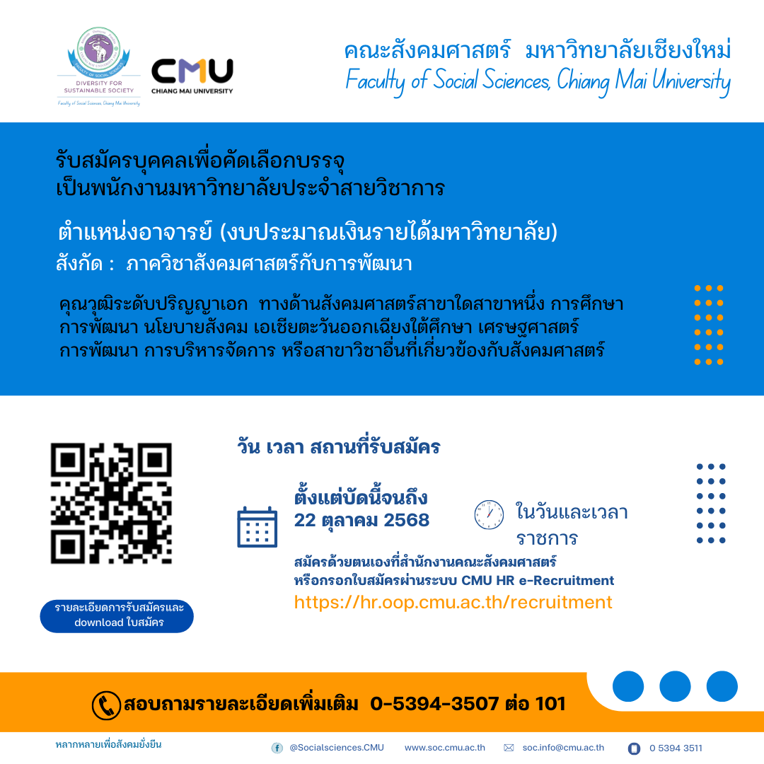 รับสมัครบุคคลเพื่อสอบคัดเลือกบรรจุเป็นพนักงานมหาวิทยาลัย ตำแหน่งอาจารย์ EP210001 ภาควิชาสังคมวิทยาและมานุษยวิทยา คุณวุฒิระดับปริญญาเอก จำนวน 1 อัตรา