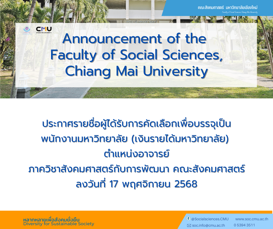 รายชื่อผู้มีสิทธิ์เข้ารับการคัดเลือก (สัมภาษณ์) ระดับคณะ ตำแหน่งอาจารย์ ภาควิชาสังคมศาสตร์กับการพัฒนา