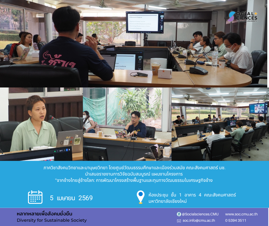 คณะสังคมศาสตร์ มช. การนำเสนอรายงานการวิจัยฉบับสมบูรณ์ แผนงานโครงการ "จากช้างไทยสู่ช้างโลก: การพัฒนาโครงสร้างพื้นฐานและทุนทางวัฒนธรรมในเศรษฐกิจช้าง